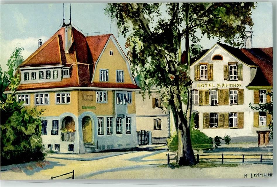 8580 Amriswil Künstlerkarte sign. H. Lehmann Hotel Bahnhof Kantonalbank