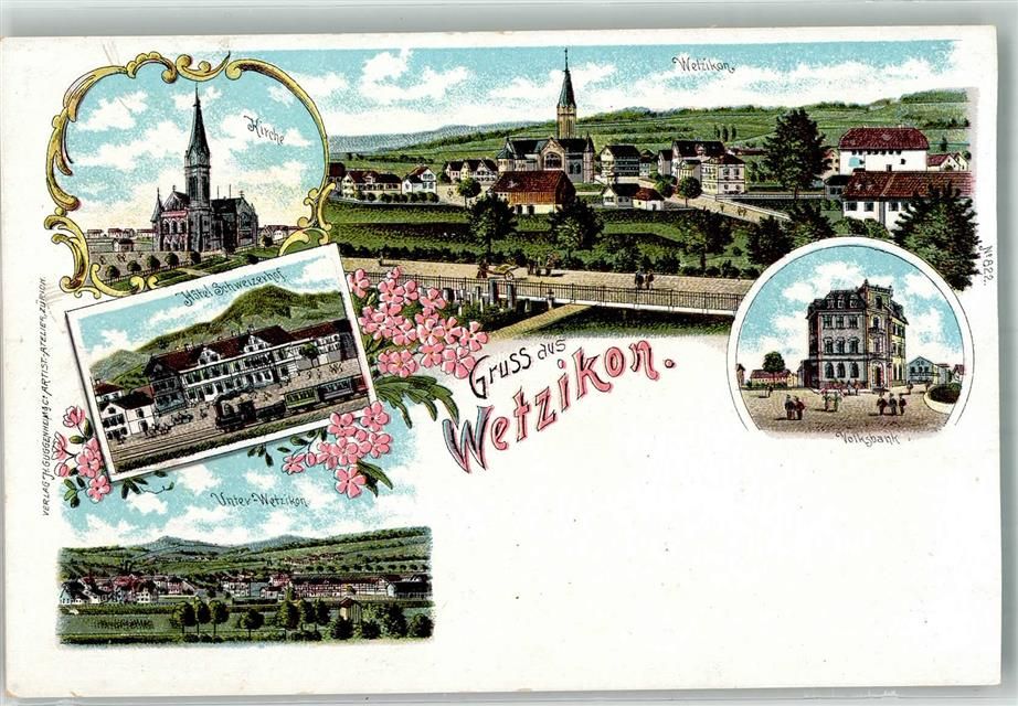 Wetzikon ZH, Lithographie Volksbank Kirche Hotel Schweizerhof leicht beschnitten