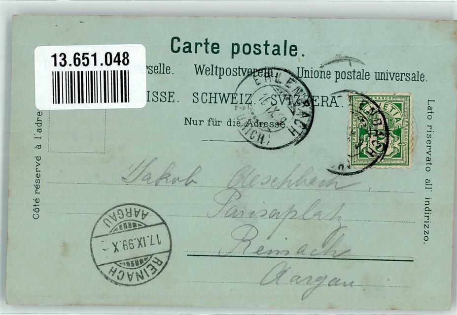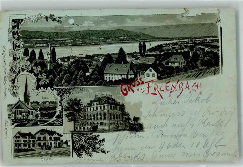 8703 Erlenbach ZH 1899 Lithographie Kirche Hotel Kreuz Bahnhof