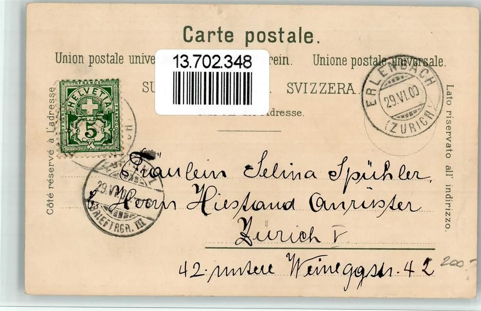 Erlenbach ZH, Lithographie Kirche Haus Geschwister Stiefel Bahnhof Verlag Künzli Nr 867
