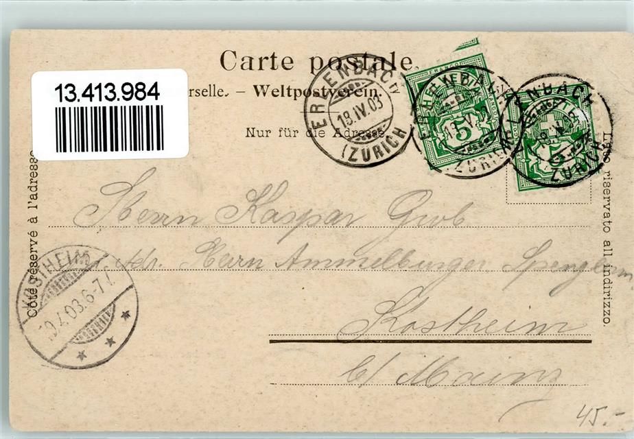 8703 Erlenbach ZH 1903 Gebrauchsspuren Hotel Zum goldenen Kreuz Inh. Wilh. Amsler