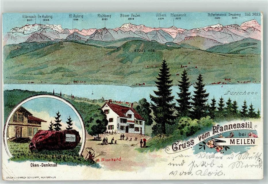 Meilen, Oken Denkmal Gruß von Pfannstil sign. Bosshard