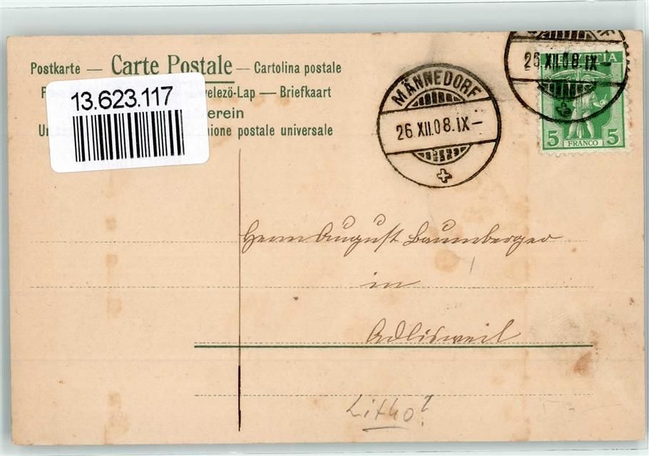 8708 Männedorf 1908 Lithographie Fröhliche Weihnachtsgruß Engel