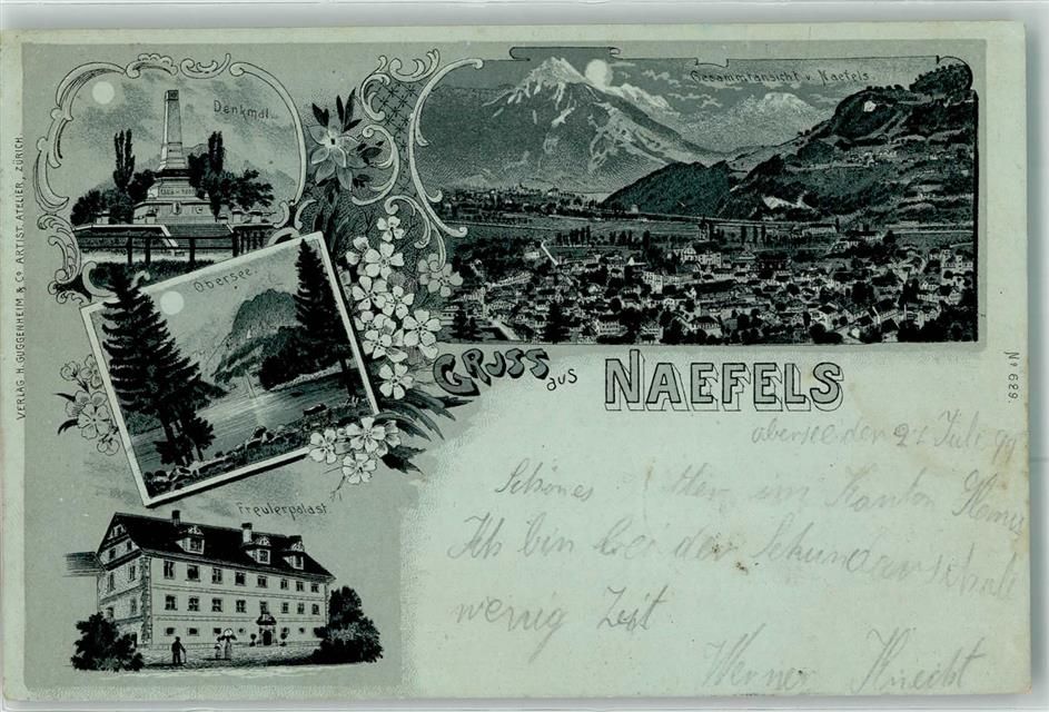 8752 Näfels 1899 Lithographie / Mondschein Denkmal Obersee Freulerpalast