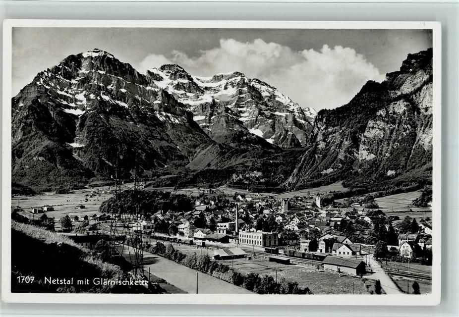 8754 Netstal 1952 Foto AK mit Bahnhif, Glärnischkette