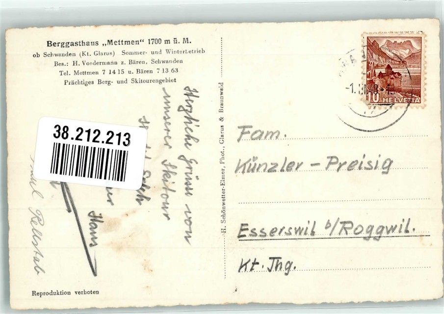 8762 Schwanden GL 1938 Winter Gasthaus Mettmen