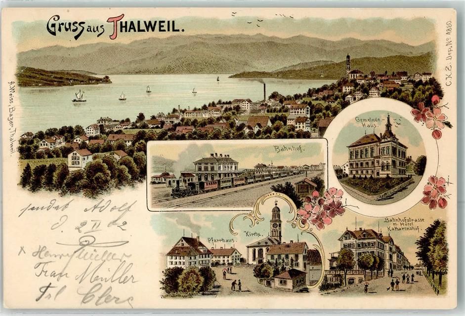 8800 Thalwil 1902 Lithographie Bahnhof Eisenbahn Gemeindehaus Pfarrhaus Kirche Bahnhofstrasse Hotel Katharinahof