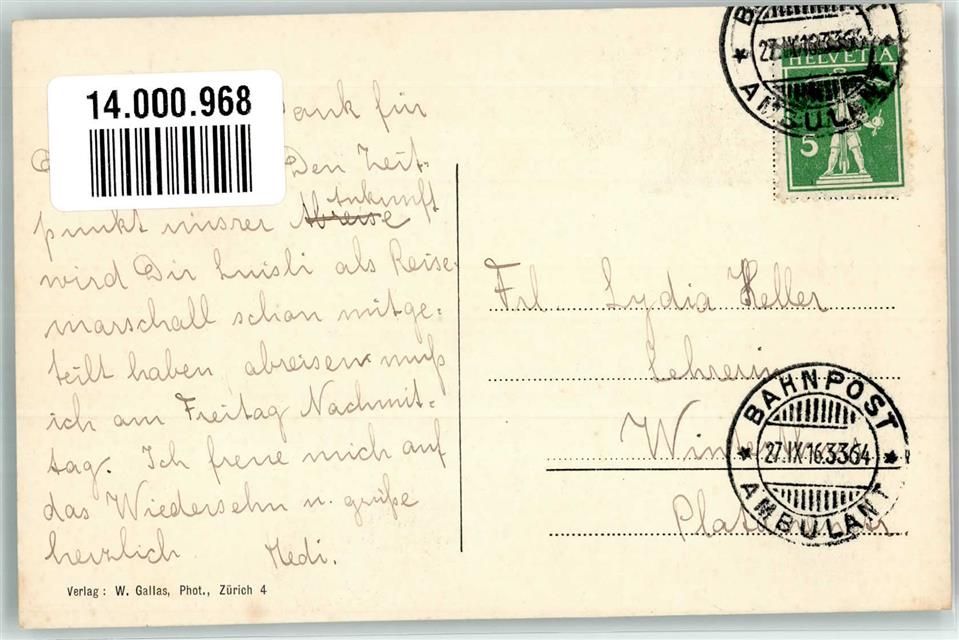 8805 Richterswil 1916 Foto AK Bahnpost Zug 3364 Schulhaus Breiten
