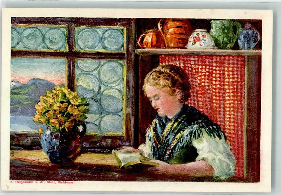 8805 Richterswil Künstlerkarte sign. Stutz Lesende Frau Tracht Blumenstrauss
