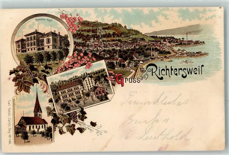 8805 Richterswil Lithographie Kranken-Asyl Schulhäuser Kirche Raddampfer Verlag Künzli Nr 497