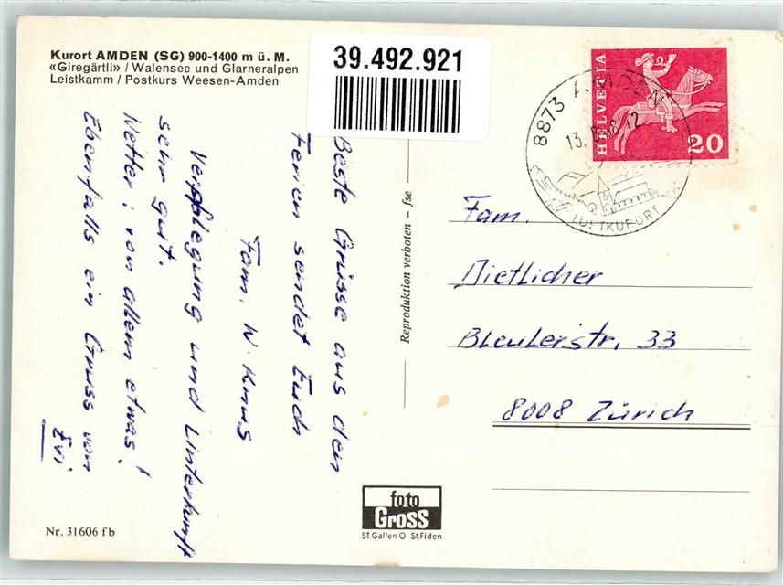 8873 Amden - Sessellift Postkurs Omnibus Walensee Kühe Giregärtli Leistkamm