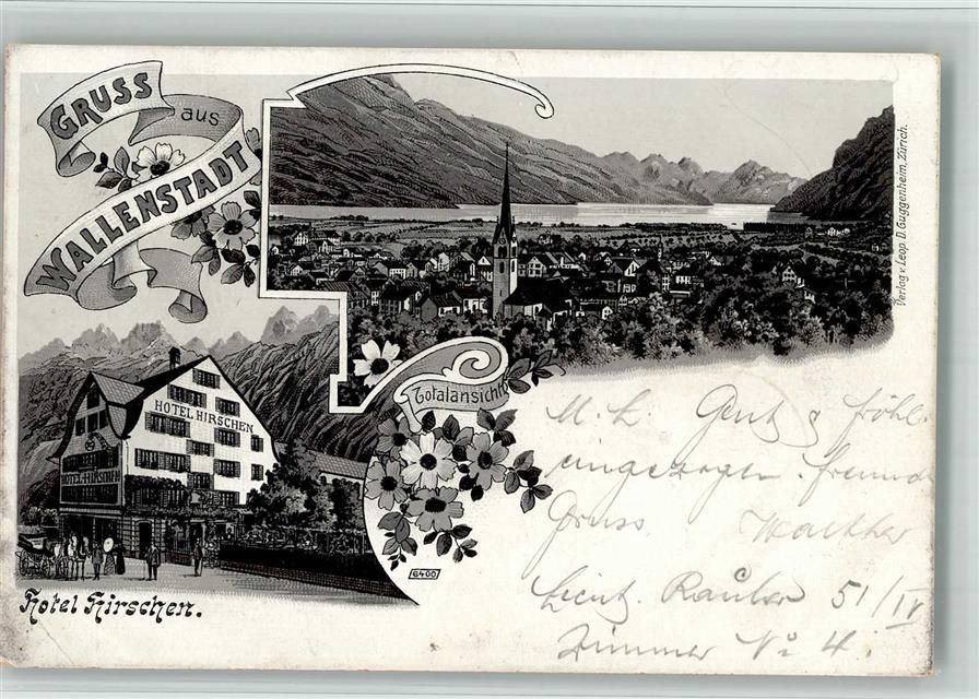 8880 Walenstadt 1904 BOAKC Lithographie Hotel Hirschen Gebrauchsspuren, bitte Scan genau beachten!