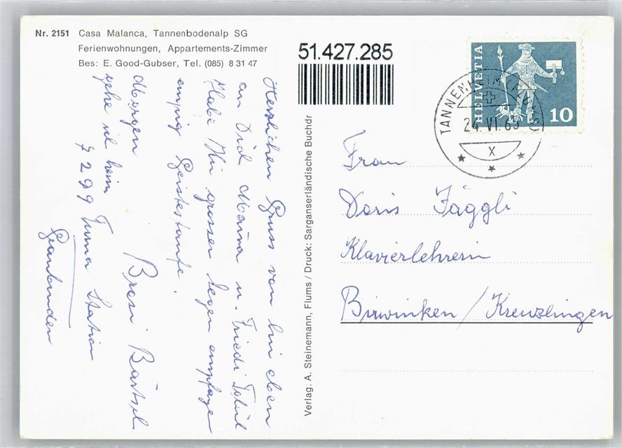 8890 Flums 1965 - Pension Tannenbodenalp