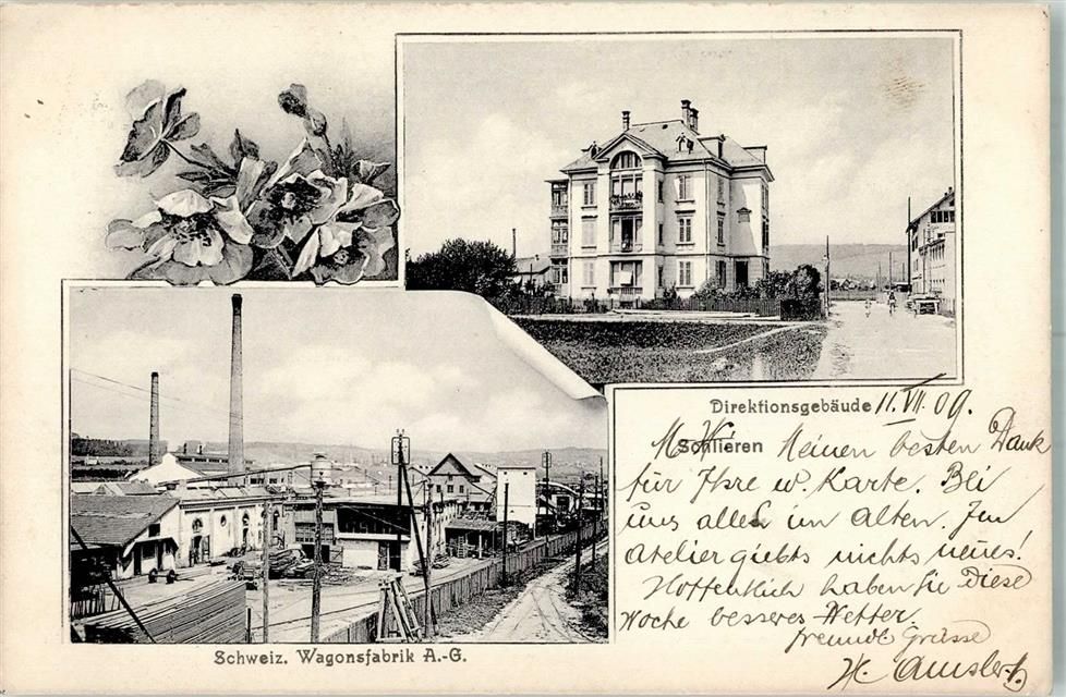 8952 Schlieren 1909 Foto AK Fabrik -Waggons AG Direktionsgebäude Feldpost Militärsache