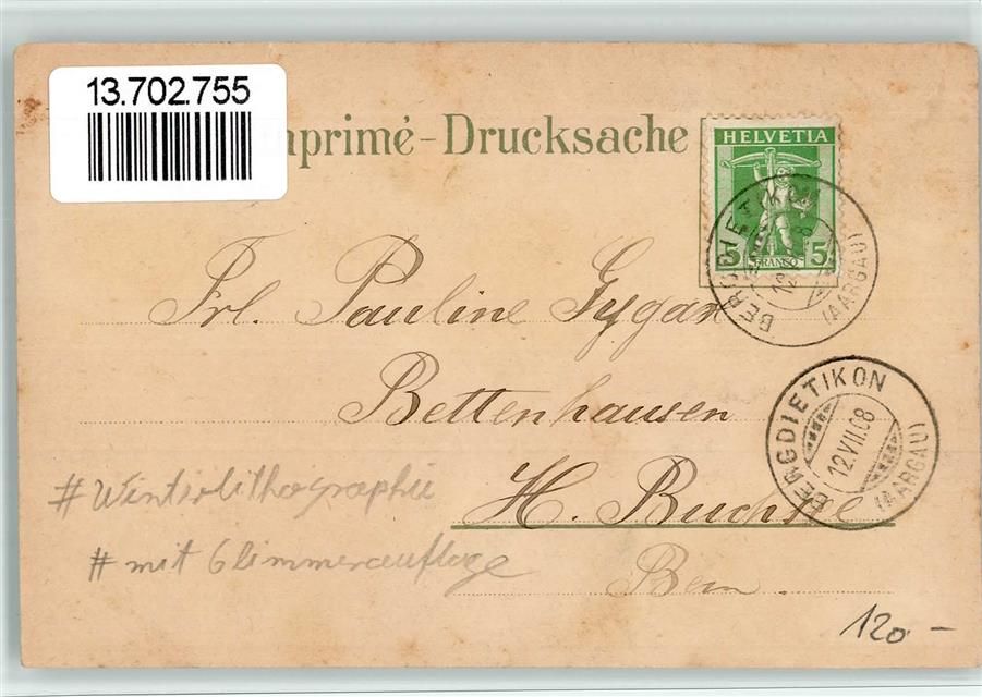 Dietikon, Winterlithographie Kirche Gasthaus Schmidstube Schulhaus Gasthaus Zur Krone Gebrauchsspuren, bitte Scan genau beachten!