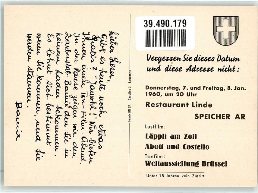 9042 Speicher - Schwäne Werbekarte Gasthaus Linde Kino Ort lt. Recherche