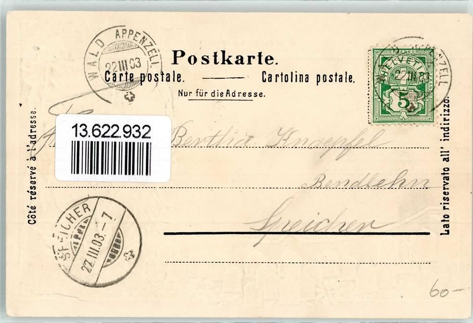 9044 Wald AR Prägedruck Helvetia Wappen Lithographie
