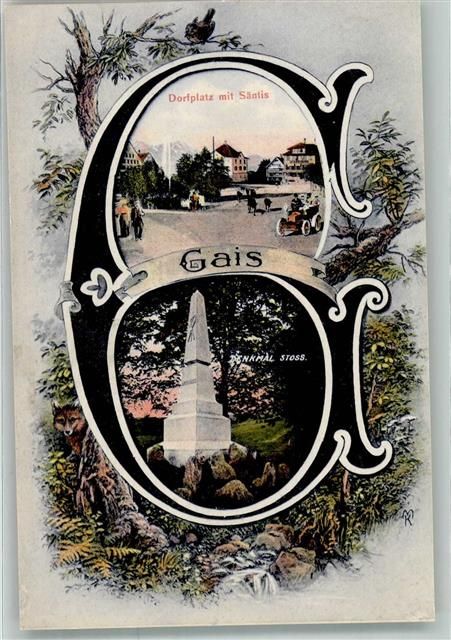 9056 Gais 1908 - Buchstaben AK Dorfplatz m. Säntis Denkmal Stoss