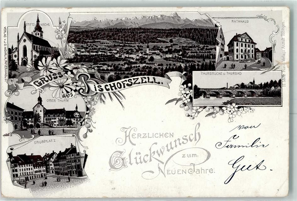 Bischofszell, Gruss aus Lithographie Kirche Stiftskirche Rathaus AK