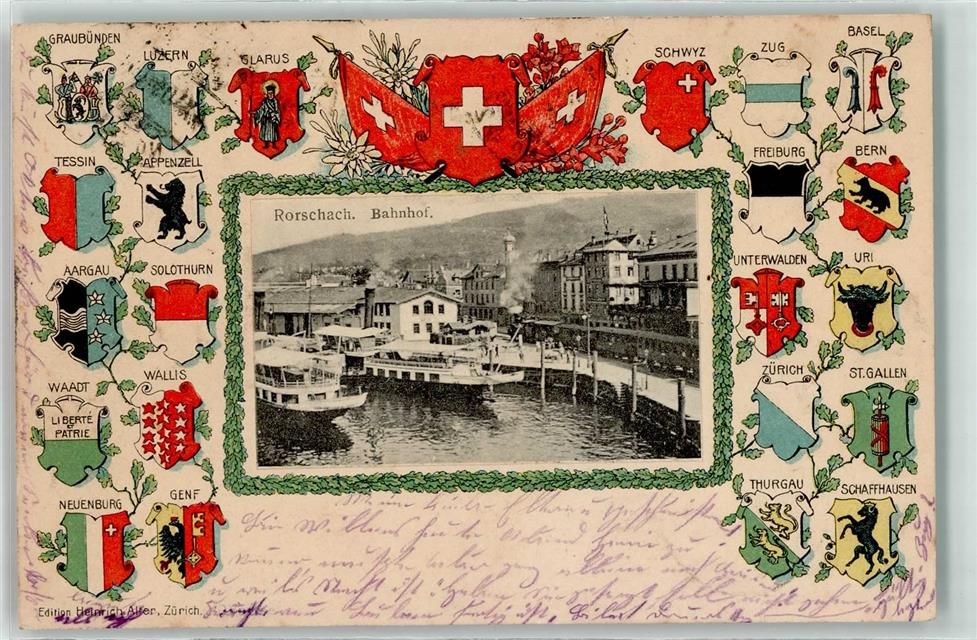9400 Rorschach 1905 Prägedruck Bahnhof Hafen Eisenbahn Lok Dampf Schiff Wappen Blumen