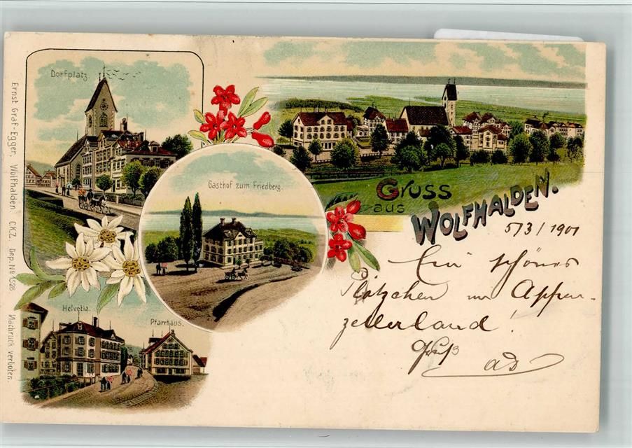 9427 Wolfhalden 1901 BOAKC Lithographie Dorfplatz Gasthaus Zum Friedberg Pfarrhaus Helvetia Edelweiß Verlag Künzli Nr 1528