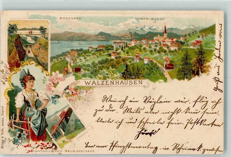 9428 Walzenhausen 1901 Lithographie BodenseeVorarlberge Tracht Drahtseilbahn nach Rheineck
