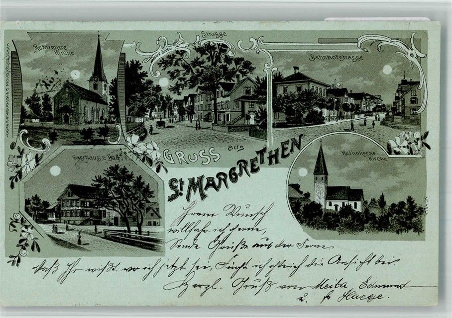St. Margrethen SG, Ref. Kirche Bahnhofstrasse Gasthaus zum Bad Kath. Kirche Lithographie