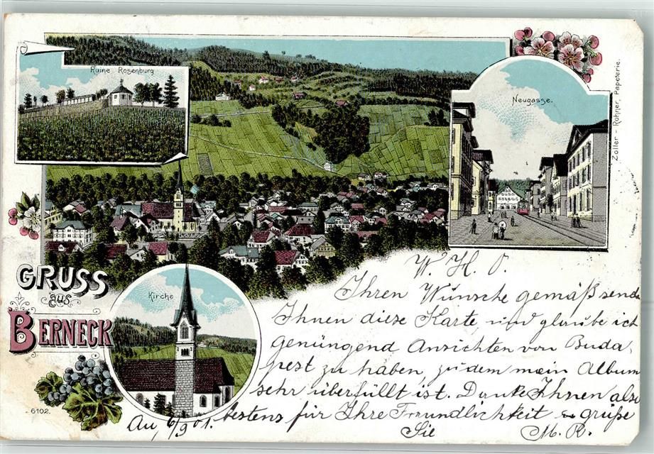 Berneck, Ruine Rosenburg Neugasse Kirche Lithographie