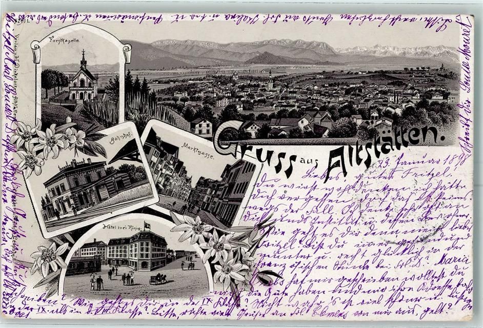 9450 Altstätten SG 1898 Lithographie Forstkapelle Bahnhof Hotel Drei König Marktgasse