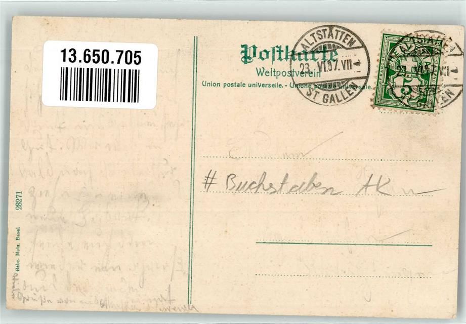 9450 Altstätten SG 1907 - Buchstaben AK Forstkapelle Rathaus Post