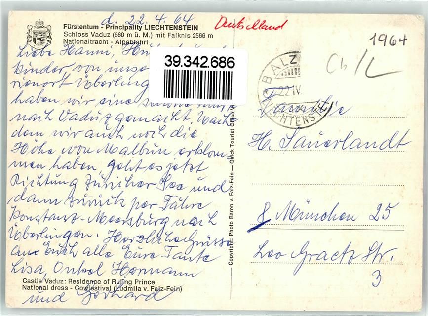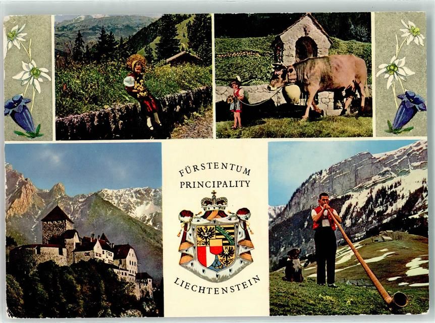 9490 Vaduz - Schloss Falknis Nationaltracht Alpabfahrt Kuh Glocke Wappen Alphorn