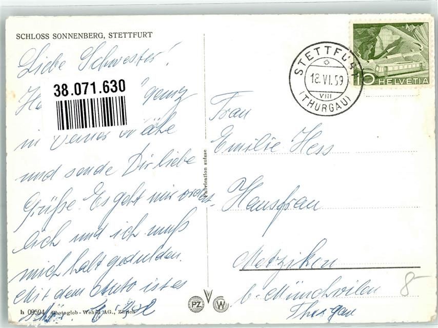 9507 Stettfurt 1959 Foto AK Schloss Sonnenberg