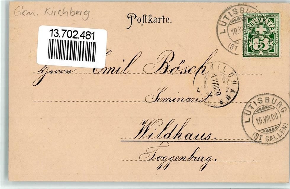 9533 Kirchberg SG 1900 BOAKC Lithographie Bazenhaid