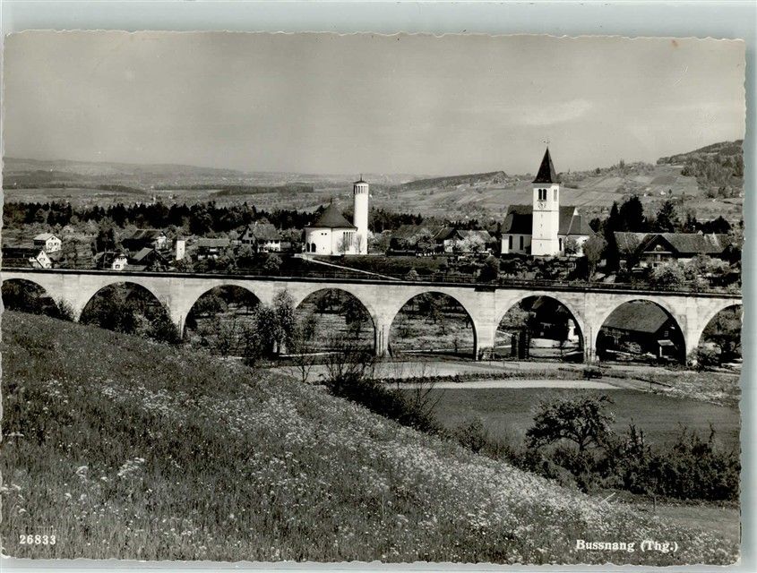 9565 Bussnang 1957 Foto AK Kirche Brücke