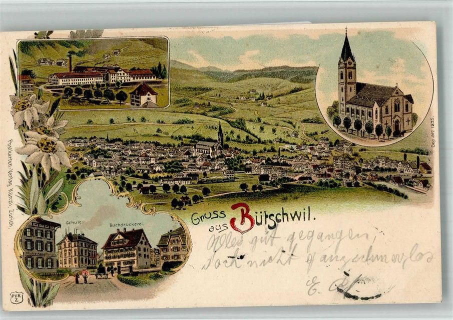 Bütschwil, Kirche Schule Fabrik Buchdruckerei Bahnpost Zug 125 Lithographie