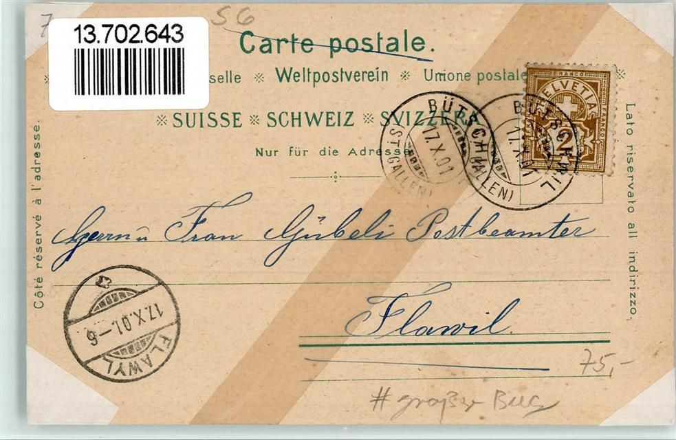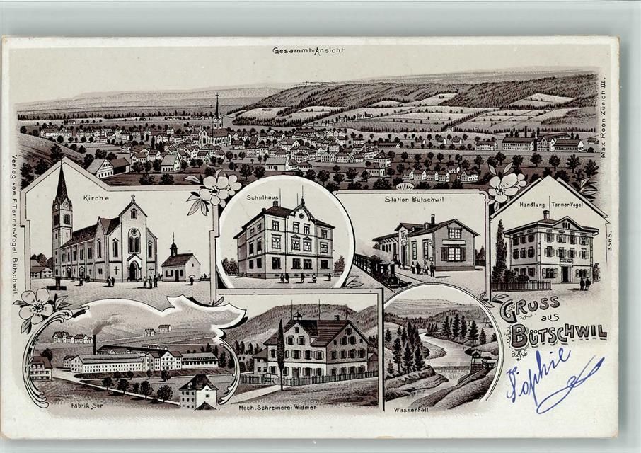 Bütschwil, Lithographie Fabrik Sor Mech. Schreinerei Widmer Wasserfall Handlung Tanner-Vogel Station Bahnhof Schulhaus Kirche Großer Bug Gebrauchsspuren, bitte Scan genau beachten!