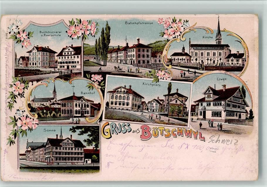 Bütschwil, Lithographie Buchdruckerei Realschule Bahnhofstraße Kirche Bahnhof Kirchplatz Löwen Sonne Gebrauchsspuren, bitte Scan genau beachten!