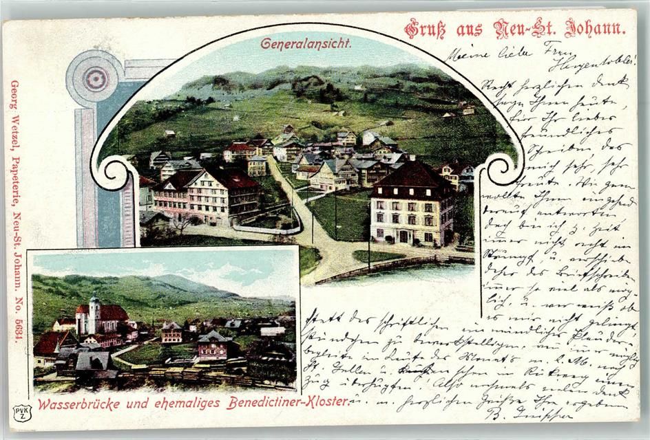 9652 Neu St. Johann 1900 Lithographie Wasserbrücke und ehemaliges Benediktiner Kloster