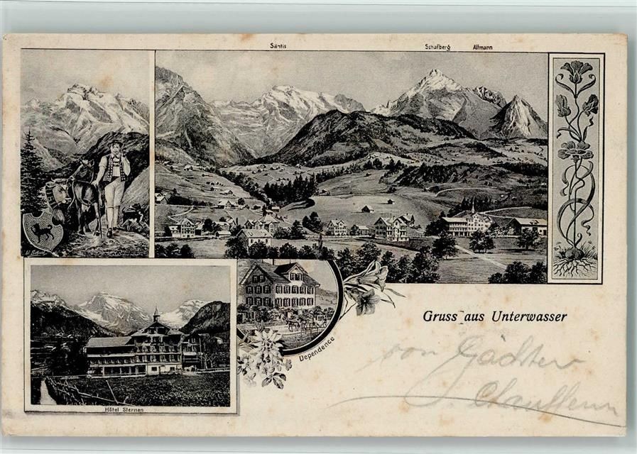 9657 Unterwasser Lithographie Säntis Schafberg Altmann Hotel Sternen Dependence