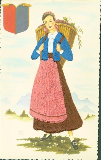 AK mit Stickerei Frau mit Rückentragekorb