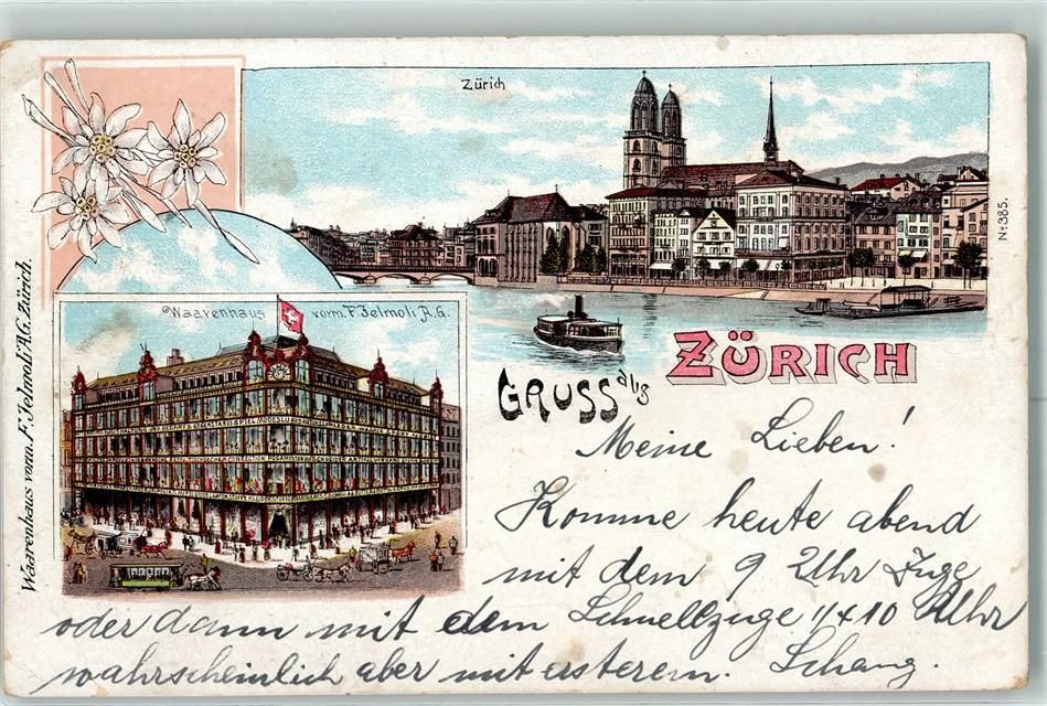 Zürich, Gruss aus Lithographie Warenhaus Pferdestraßenbahn AK