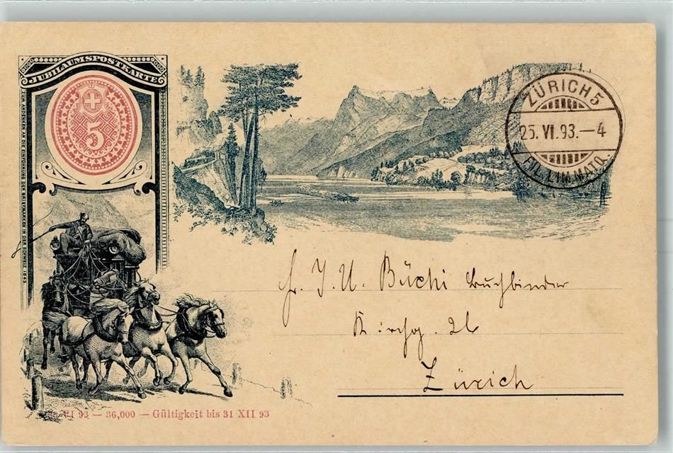 Zürich, Jubiläumspostkarte Einführung der Briefmarke Postkutsche Vorläufer Ersttagsstempel