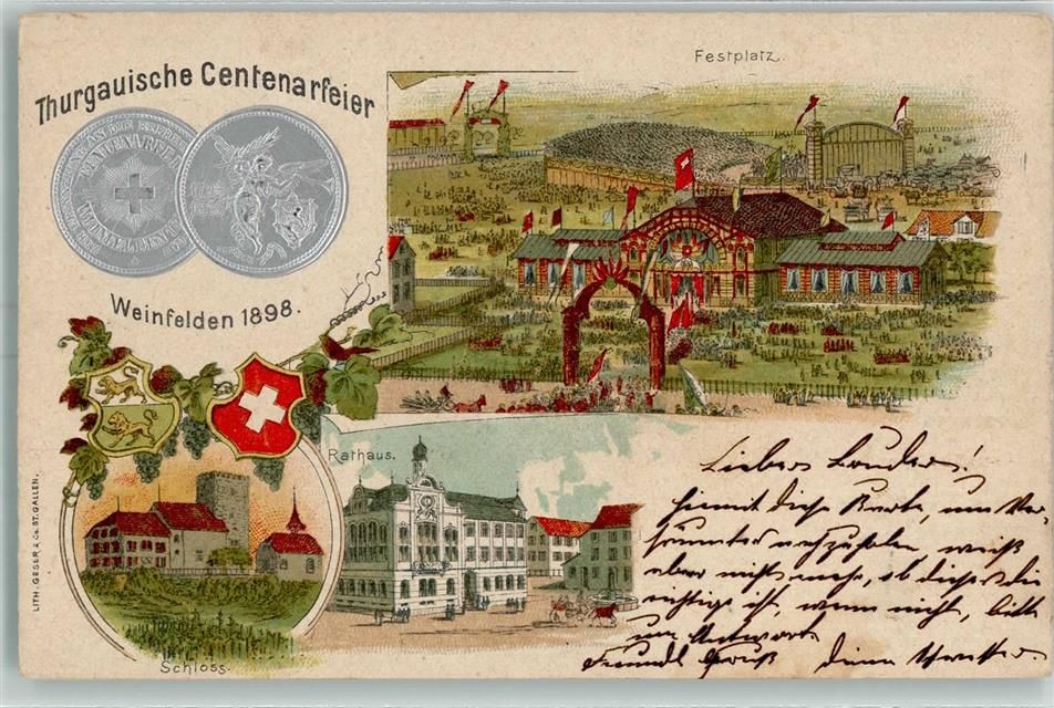 Weinfelden, Thurgauische Centenarfeier Festplatz Rathaus Schloss Lithographie
