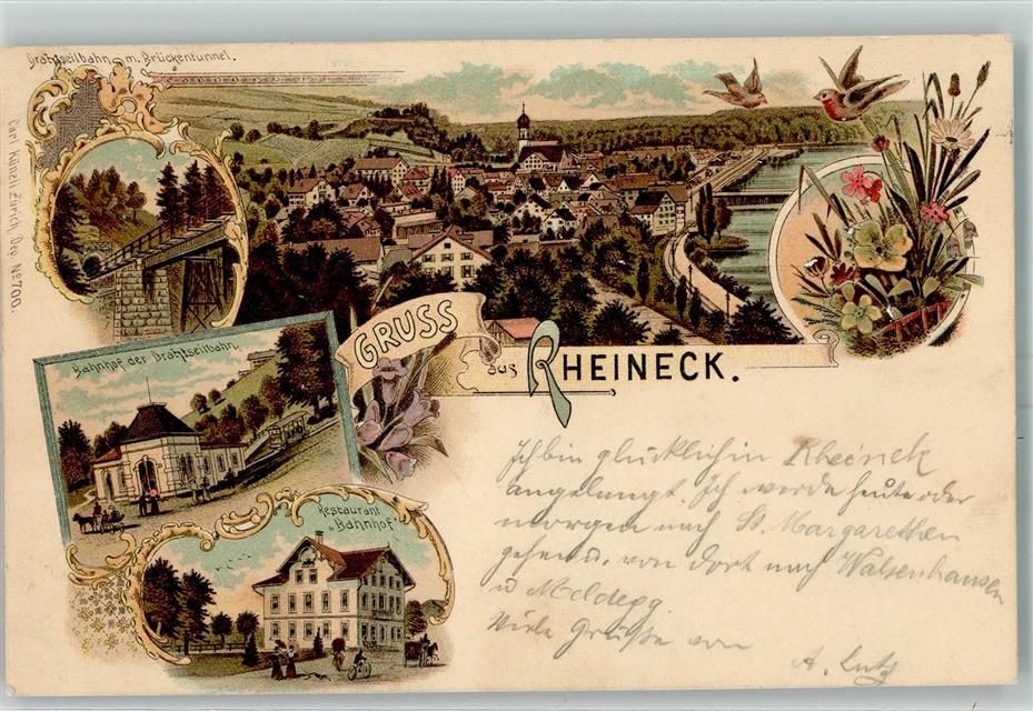 Rheineck, Gruss aus Restaurant "Bahnhof" und Drahtseilbahn Bahnhof , Verlag Künzli 700 AK