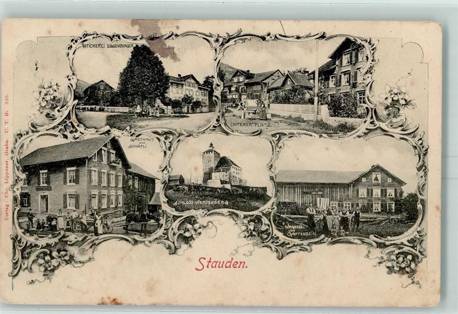Grabs, Studen (Stauden) Gasthaus zum Schäfli Familie steht vor dem Haus , Wagnerei mit Familie , Stickerei Eggenberger AK