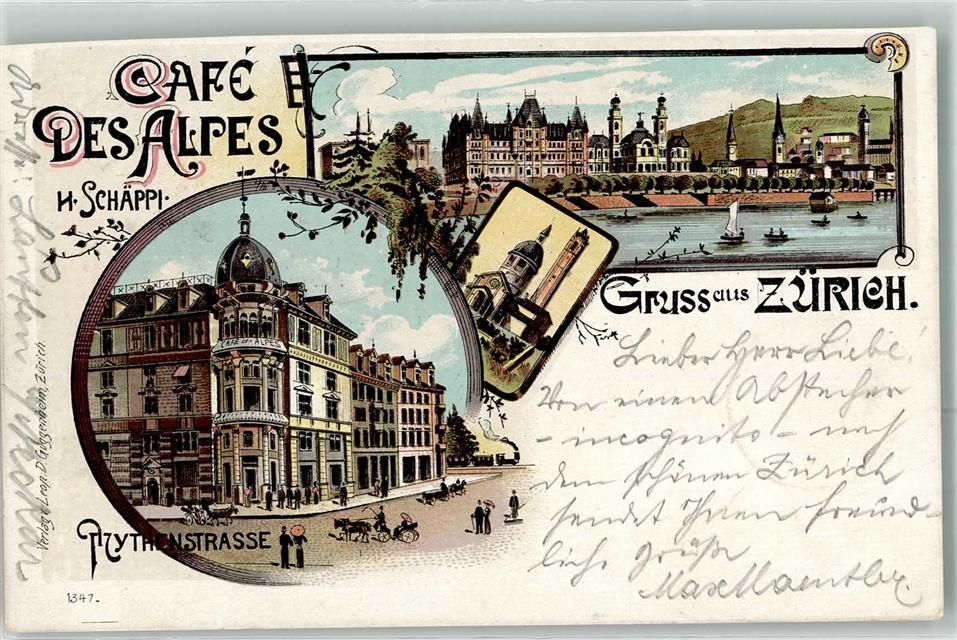 Zürich, Cafe des Alpes H. Schäppi Mythenstrasse Kirche