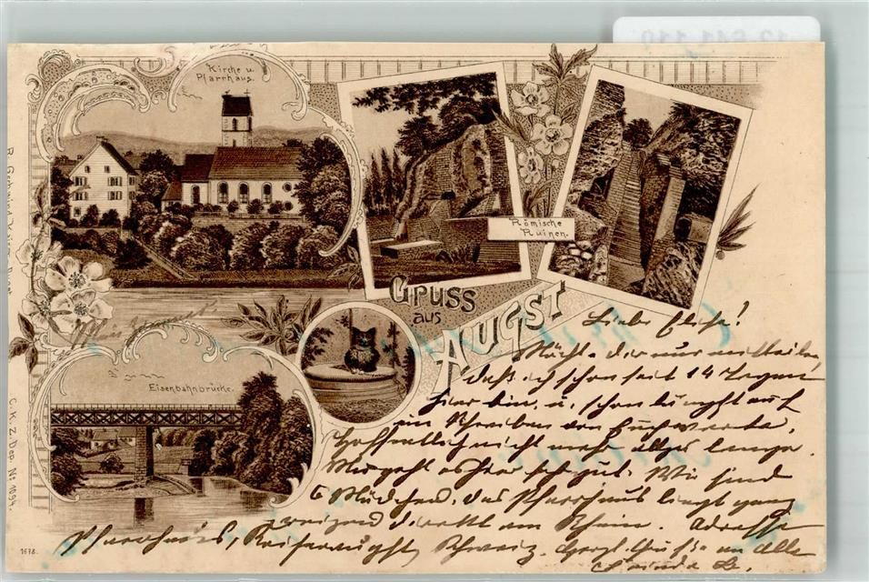 Augst BL, Lithographie Eisenbahnbrücke Kirche beschnitten