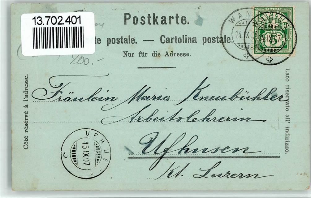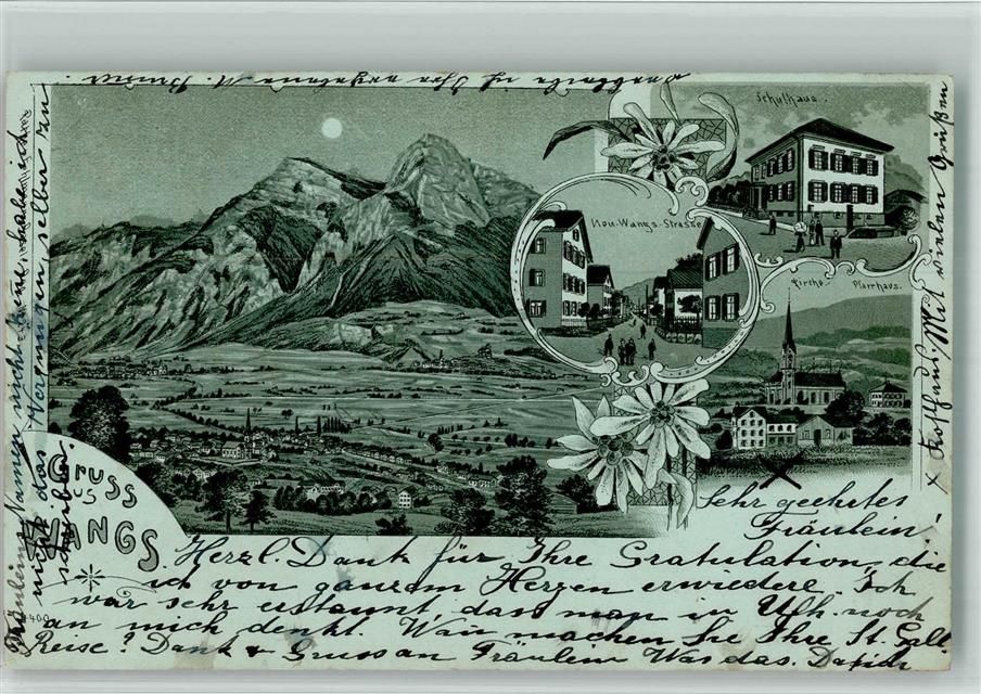 Wangs, Lithographie/Mondschein Schulhaus Neu Wangs Straße Kirche Pfarrhaus