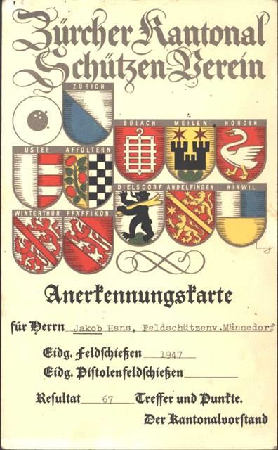 Zürich, Anerkennungskarte Wappen 1947 Feldschießen, KEINE AK, ca. 19,5x12,1 cm; Eckloch