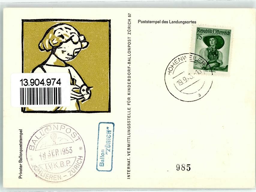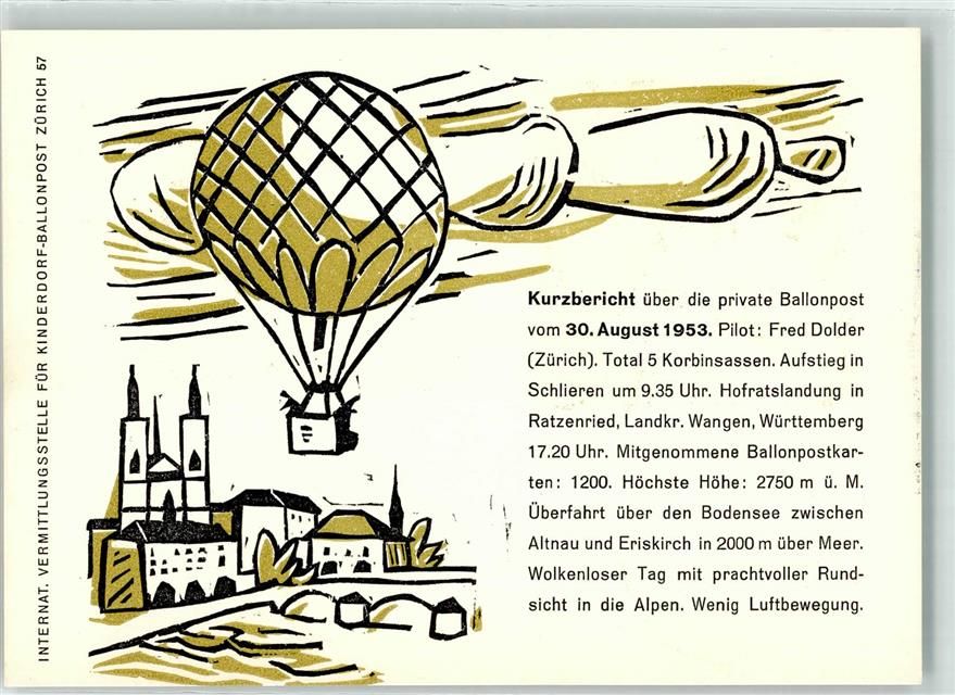 Schlieren, Ballon Zürich 30. August 1953 Pilot Fred Dolder Internat. Vermittlungsstelle für Kinderdorf-Ballonpost Zürich